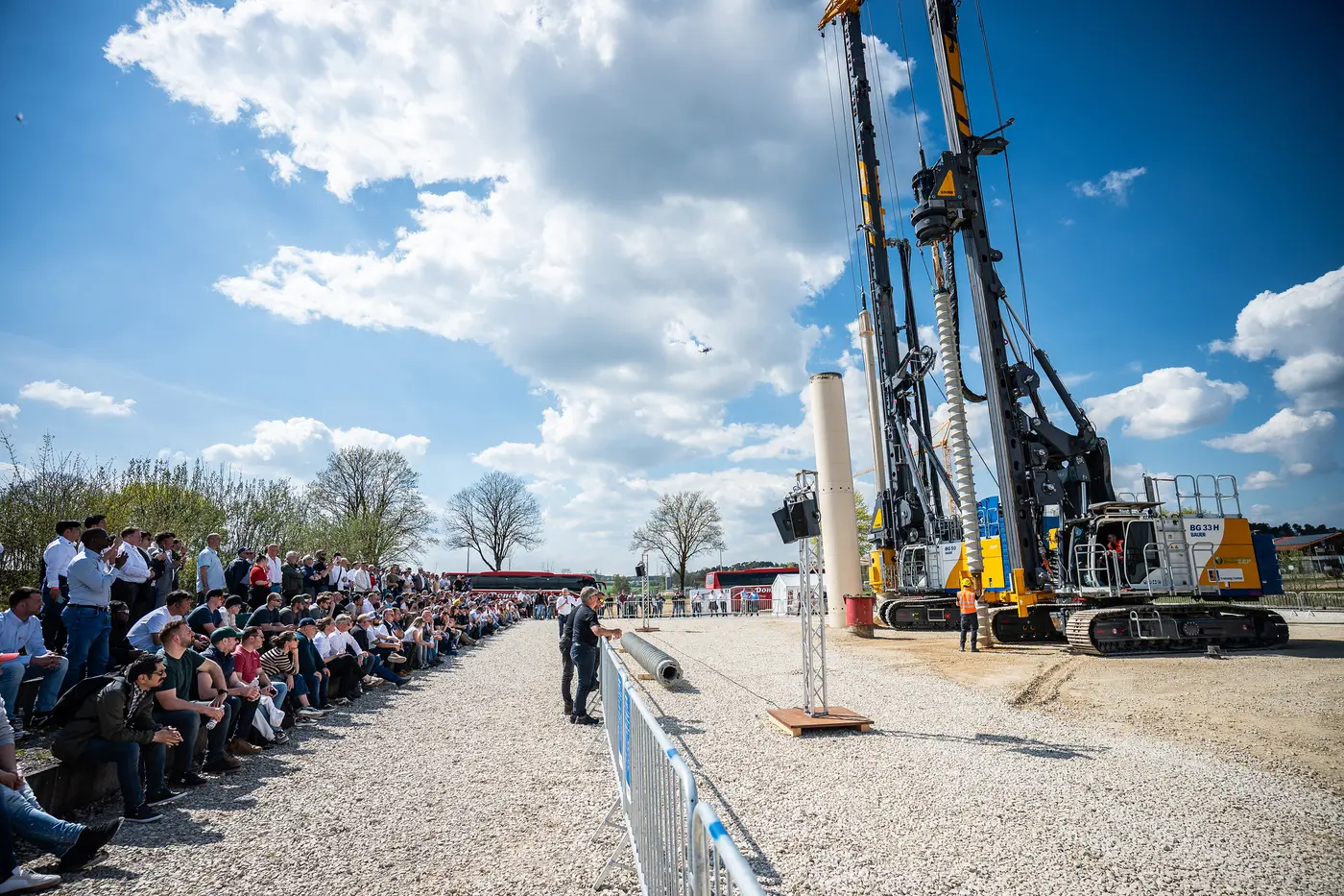 Per l’occasione, il piazzale della sede storica si è trasformato in un’area espositiva, dove il costruttore ha sfoggiato una selezione rappresentativa della propria gamma. Il focus è stato posto sulle perforatrici, tra cui la BG 50, successore del modello di grande diffusione BG 45 nella classe a cinematica V. Oltre al nuovo carro portante BT 145, che integra numerose soluzioni già collaudate come la piattaforma di servizio integrata, la macchina offre una coppia superiore e prestazioni di perforazione incrementate. Tra i miglioramenti, la profondità di perforazione in singolo passaggio è stata aumentata del 7% e la forza di tiro dell’argano principale dell’11%. La BG 50 è progettata per elevate prestazioni idrauliche e dispone ora anche di una potenza diesel di 470 kW, pari a un incremento dell’8%. Le operazioni di montaggio e smontaggio risultano semplificate, con la possibilità di erigere un mast esteso senza l’ausilio di gru ausiliarie.