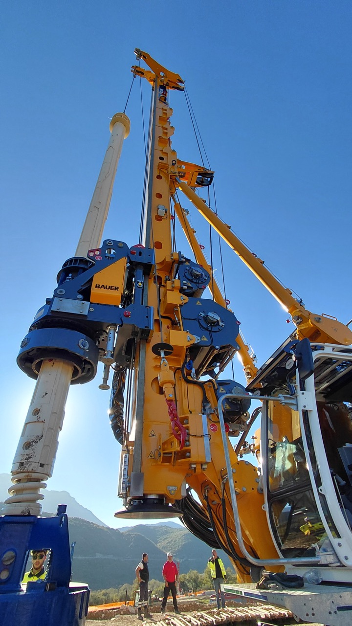 Le prestazioni parlano di una coppia effettiva di 235 kNm con un asse di perforazione 1.000, quindi maggiorato rispetto alla sorella BG23H e questo permette di affrontare diametri fino a 1.400 mm in caso di palo rivestito e di 1.700 mm non intubato, con aste Kelly che variano dalle classiche corte da 21-24 m fino ad aste da 44 m. Essendo una macchina della gamma Premium Line, la BG23V oltre al palo trivellato può eseguire molteplici tecnologie come CFA, FDP e Soil Mixing colonnare. Con 65 t di peso operativo, la BG23V messa a disposizione da Bauer Macchine Italia è equipaggiata con tutti gli ultimi sistemi di supporto allo scavo: il sistema di tiro combinato con gli argani nell’estrazione del rivestimento, il sistema di visualizzazione delle tasche dell’asta Kelly per evitare danneggiamenti durante lo scavo ed l’interfaccia B Tronic di ultima generazione. Da segnalare la possibilità di installare la nuova funzione Stability Plus che regola in maniera automatica la velocità della ralla in rotazione in base al tipo di palo in esecuzione. Si tratta di una nuova funzione di sicurezza che permette di avere sempre la massima velocità di rotazione della ralla nel range di sicurezza e non richiede all’operatore nessun settaggio, ma solo l’indicazione del diametro del palo e degli elementi in uso. Infine, la BG23V è equipaggiabile anche con il pacchetto super-ribassato, cioè con un’antenna ad altezza ridotta e una rotary a cestello maggiorato, per realizzare pali trivellati anche sotto gli 8 m di limite altezza operativa macchina.